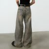 ■バイオブリーチ加工で色落ちさせたワイドデニムパンツ バイオブリーチ加工でムラ感のある色落ちをさせ、擦り、髭加工で濃淡をつけ、オーバーダイ加工(汚し加工)で仕上げした拘りの一本です。