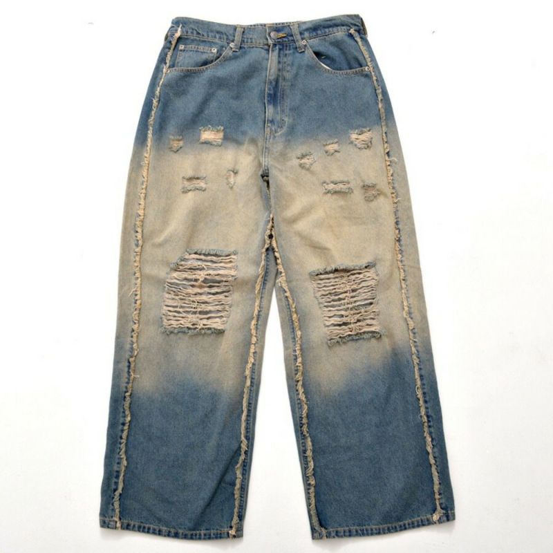 デニムパンツ メンズ ブランド おしゃれ デニム ジーンズ ジーパン Gパン バギーパンツ ゆったり ボトムス グラデーション フリンジ ダメージ加工 ヴィンテージ ユーズド M L 春服 夏服 秋服 冬服 メンズファッション 大人 カジュアル ストリート系 韓国ファッション 下北系 古着系 90年代 Y2K プレゼント ギフト ブラック サックス