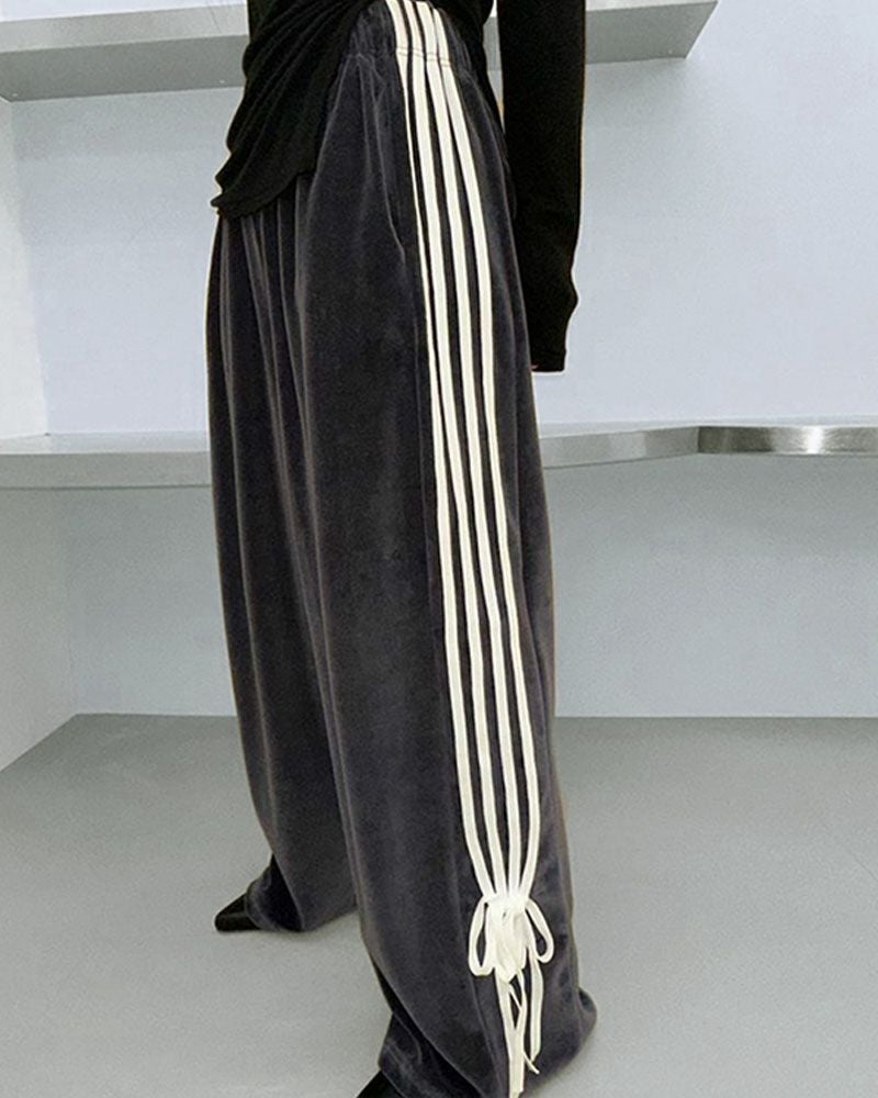 韓国ファッション おしゃれ カジュアル 春 夏 秋 冬 ボトムス パンツ ロングパンツ ベロアパンツ ラインパンツ カジュアル リボン ワイドパンツ サイドライン バレエコア ブロークコア アクビファッション レディース Y2K ストリート ブラック 黒 韓国系 地雷系 サブカル系 ピープス系 Y2Kファッション オルチャン 地下アイドル メン地下 韓スト 韓流 KPOP アイドル K-POP