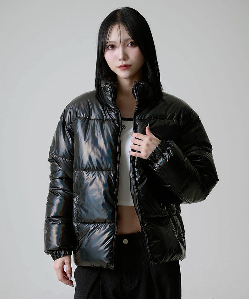 光沢感のあるシャイニー生地を使った唯一無二な防寒性抜群の中綿スタンドジャケット。