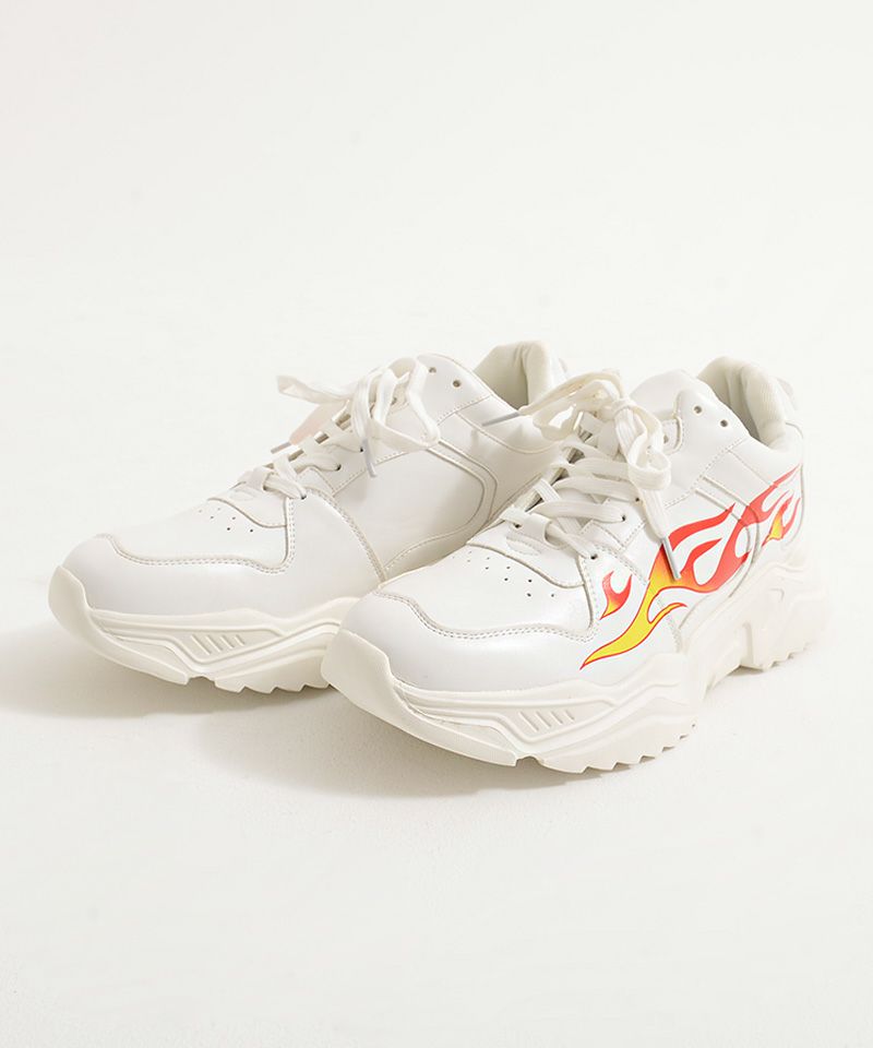 韓国ブランド 韓国ファッション スニーカー メンズ 靴 くつ クツ ダッドスニーカー シューズ 厚底 PUレザー 合皮 フェイクレザー ファイヤーパターン 黒 白 ストリート系 韓国系 韓国 春 夏 秋 冬 25cm 25.5cm 26cm 26.5cm 27cm 27.5cm