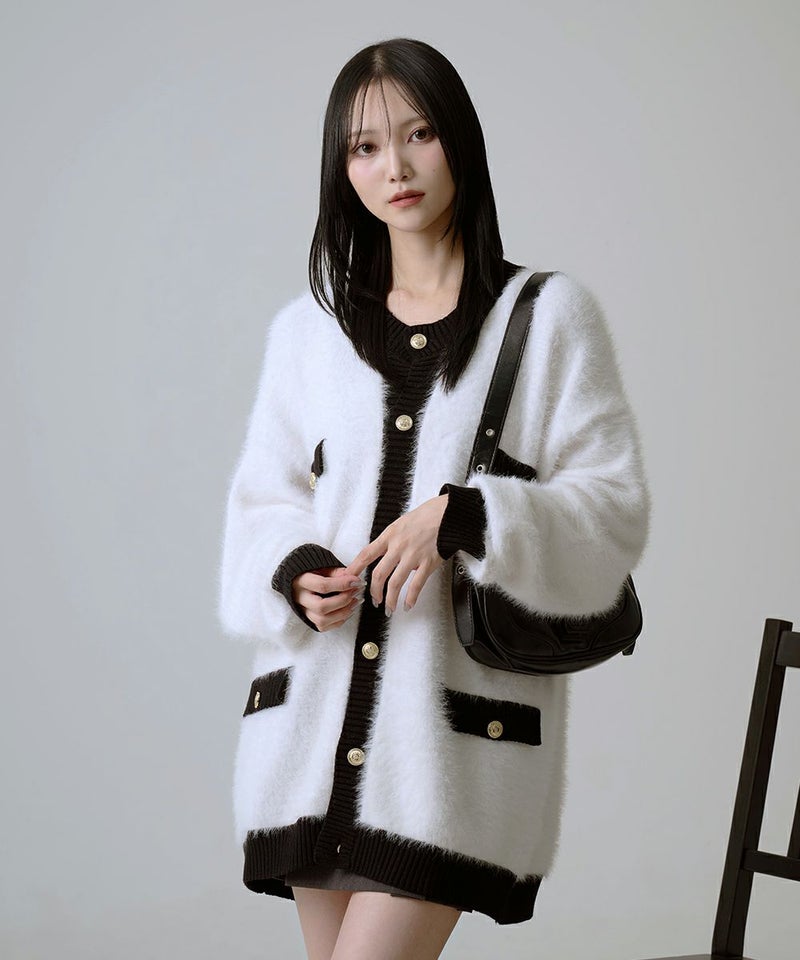カーディガン ニット レディース メンズ ブランド 大人 シャギーニット 配色切り替え トップス 大きいサイズ あったか 暖かい 上品 ブラック ホワイト 黒 白 M L ユニセックス CavariA 秋 冬 秋冬ファッション 東京 プレゼント 誕生日 記念日 贈り物 ギフト ルーズニット ルーズサイズ 保温性 ニット ストレッチ素材 ラフスタイルニット メンズカジュアル ゆったりシルエット