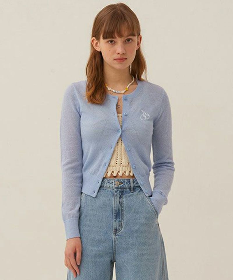 季節の変わり目にぴったりなニットカーディガン!胸元のKIRSH【キルシー】のブランドアイコンのさくらんぼの刺繍がポイントになっています。