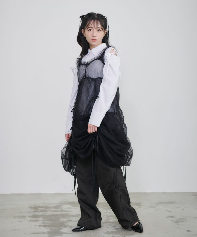 キャミワンピ フリル トップス キャミソール チュール シアー シースルー ロングワンピ フェミニン 大人 甘め チュール リボン バレエコア フレンチガーリー ブラック 黒 ホワイト 白 アイボリー キャミ ノースリーブ ドローストリング ドロスト シャーリング
