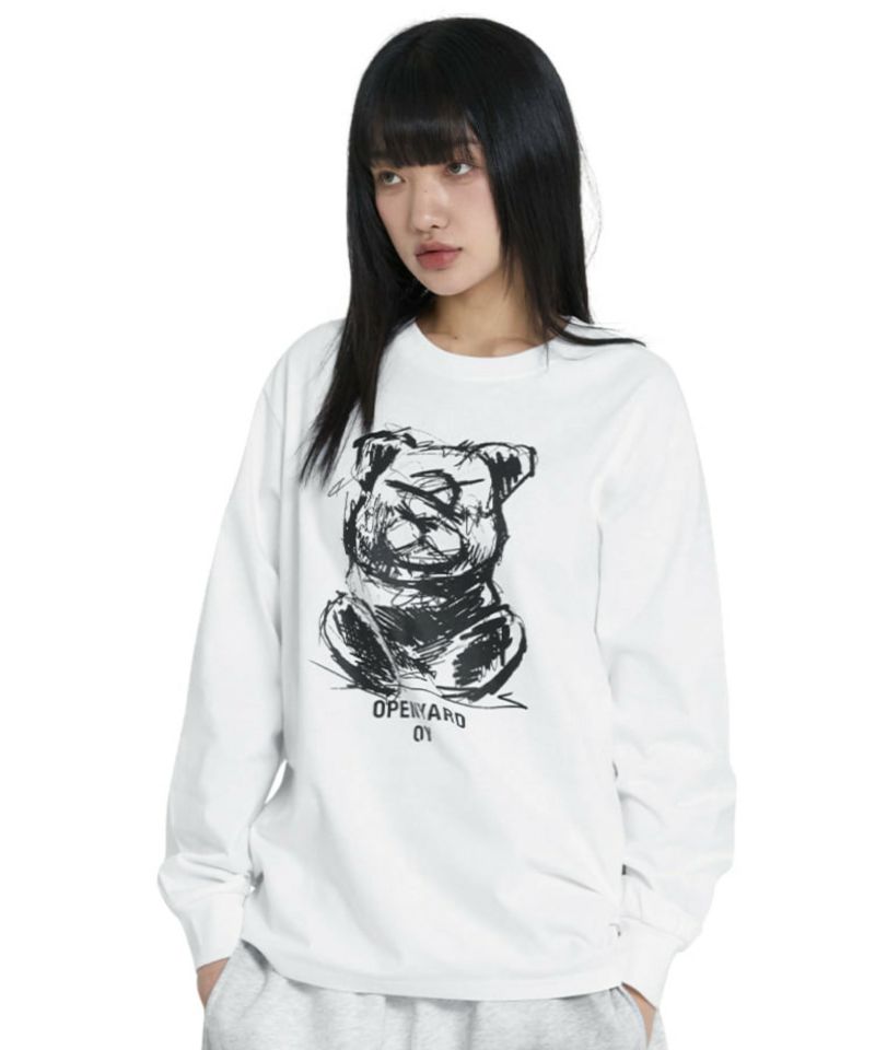 OY オーワイ 韓国ブランド 韓国ファッション 30代ファッション 40代ファッション 体型カバー 長袖Tシャツ ロングスリーブTシャツ クマ イラスト スケッチデザイン カジュアル トップス レディースファッション 韓国トレンド 春 秋 冬 ブラック ホワイト