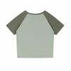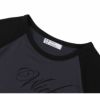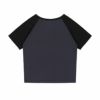 このデザイン要素は、Tシャツに遊び心とスポーティな雰囲気をもたらし、ラグランカラーがアイテム全体にダイナミックな印象を与えています。